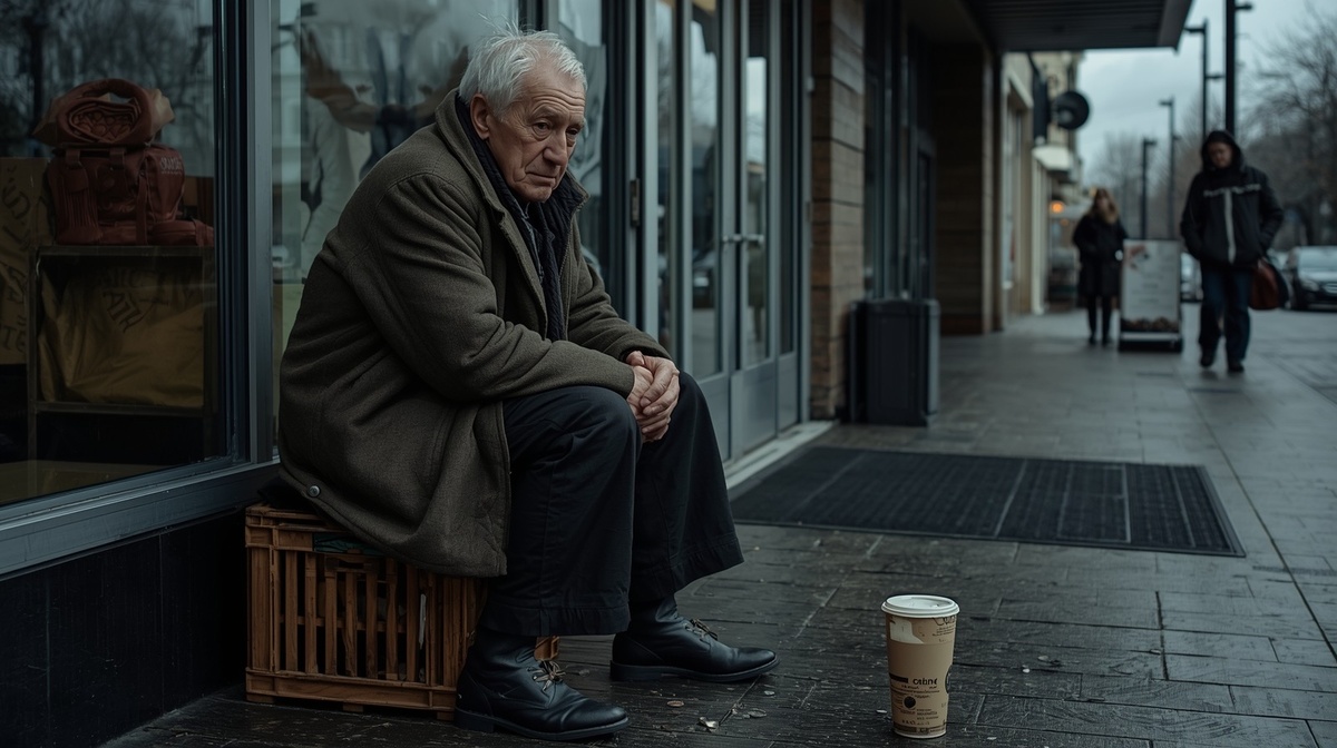 Он сидел у входа в торговый центр с самого утра — на перевёрнутом ящике из-под овощей, которые привозят по ночам в соседний продуктовый. Ящик был твёрдый, неудобный, углы давили сквозь тонкое пальто. Но другого не было, и он давно привык не замечать таких вещей.