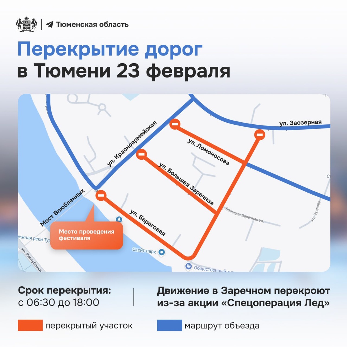 Это связано с проведением акции «Спецоперация Лед» в честь праздника — с 6:30 до 18:00 нельзя будет проехать по улицам: — Поперечной — Береговой — Большой Заречной — Ломоносова Схему объезда можно посмотреть в карточке выше ☝️ Фото: Тюменская область ❤️ Подписаться | Предложить новость | Дать «буст» | Мы в МАХ