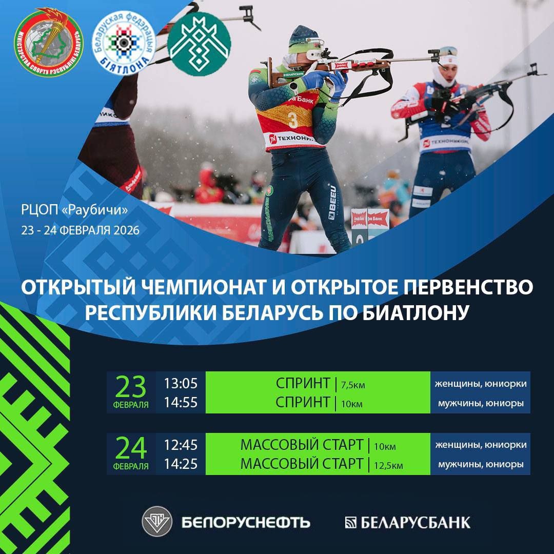 На базе Республиканского центра олимпийской подготовки по зимним видам спорта «Раубичи» 23 и 24 февраля Программа соревнований 23 февраля (понедельник) 12:40 - торжественная церемония открытия 13:05 - спринт 7,5 км (женщины, юниорки) 14:55 - спринт 10 км (мужчины, юниоры) 24 февраля (вторник) 12:45 - масстарт, 10 км (женщины, юниорки) 14:25 - масстарт, 12,5 км (мужчины, юниоры) Спортивное вещание на YouTube-канале Белорусской федерации биатлона. Ссылка будет доступна позже.