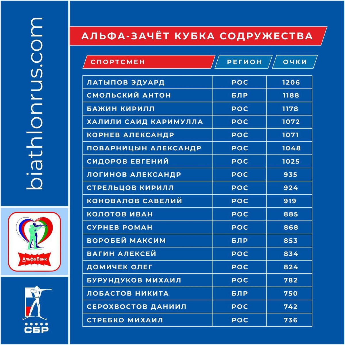 : 12 из 14 гонок Сударыни Кристина Резцова опережает Наталию Шевченко на одно очко (1257 против 1256). На третьем месте Виктория Сливко. Отставание более чем на 100 очков меньше — 1151. Судари Лидерство захватывает Эдуард Латыпов! Россиянин опережает ближайшего преследователя Антона Смольского на 18 очков (1206 против 1188). Совсем рядом и Кирилл Бажин (1178). В Мурмнске нас ждёт спринт и масс-старт, которые пройдут 3 и 5 апреля! Рейтинги СБР!