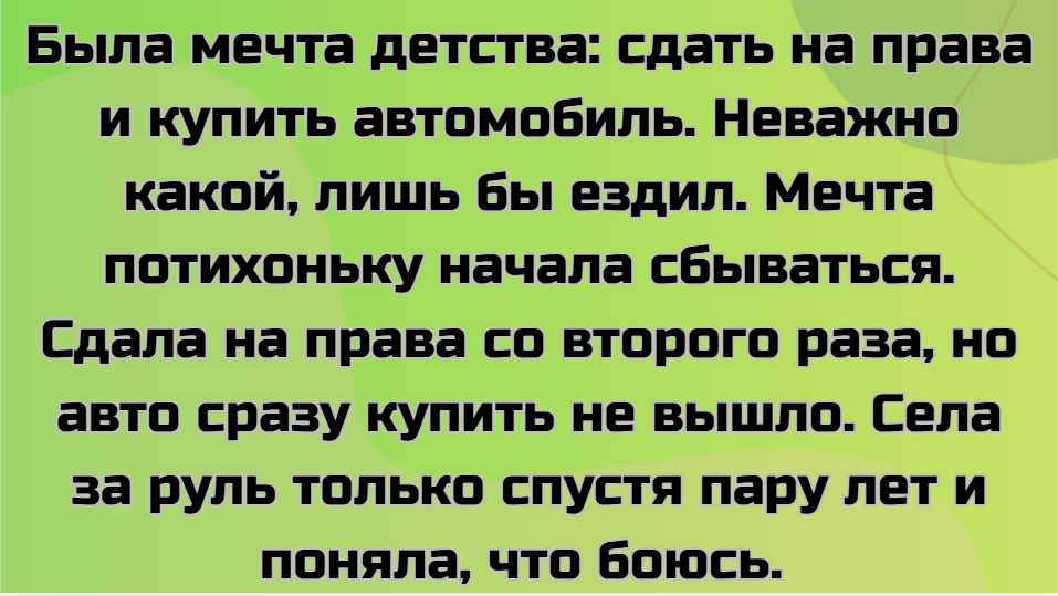 - Была мечта детства: сдать на права и купить автомобиль. Неважно какой, лишь бы ездил. Мечта потихоньку начала сбываться. Сдала на права со второго раза, но авто сразу купить не вышло. Села за руль только спустя пару лет и поняла, что боюсь. Не трясусь за рулем, но одна ездить не могу, — только если кто-то рядом сидит. Вроде и радостно, что мечта сбылась, но обидно, что я не могу ей пользоваться в полной мере. Так и живу.