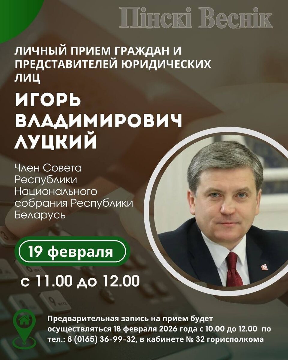 Пинск, ул. Днепровской Флотилии, д. 21) с 11.00 до 12.00 будет проводить личный прием граждан и представителей юридических лиц Национального собрания Республики Беларусь Луцкий Игорь Владимирович по предварительной записи и по вопросам, входящим в компетенцию. ⏩Предварительная запись на прием будет осуществляться 18 февраля 2026 года с 10.00 мин. до 12.00 мин. по телефону 36-99-32, в кабинете Nº 32 горисполкома. @Пинский Вестник 📱Ютуб 📱ВК 📱ИНСТАГРАМ 📱ОК 📱ФЕЙСБУК 📱ТИК ТОК Прислать новость