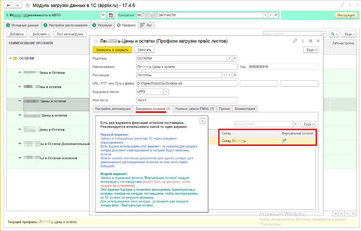 Доработана функция автозагрузки остатков - добавлена возможность загружать остатки в справочник Виртуальные остатки