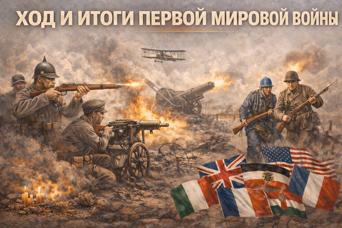 Первая мировая война стала первым по-настоящему глобальным вооружённым конфликтом, охватившим Европу, Ближний Восток, Африку и значительную часть мирового океана. В ней участвовали десятки государств, а масштабы мобилизации, разрушений и человеческих потерь не имели аналогов в прежней истории. К началу войны сформировались два военно-политических лагеря: Позднее к ним присоединились США, Италия и ряд других стран. Поводом послужило убийство эрцгерцога Франц Фердинанд в Сараеве. В течение нескольких недель локальный кризис перерос в общеевропейскую войну. Германия рассчитывала на быструю победу по плану молниеносной войны, однако наступление на Францию было остановлено в ходе Битва на Марне. Западный фронт превратился в линию окопов. Боевые действия приняли затяжной характер. Фронты почти не двигались, но потери были огромными. Ключевые сражения этого периода: Именно тогда широко применяются пулемёты, артиллерия, отравляющие газы и танки. На Востоке война носила более подвижный характе
