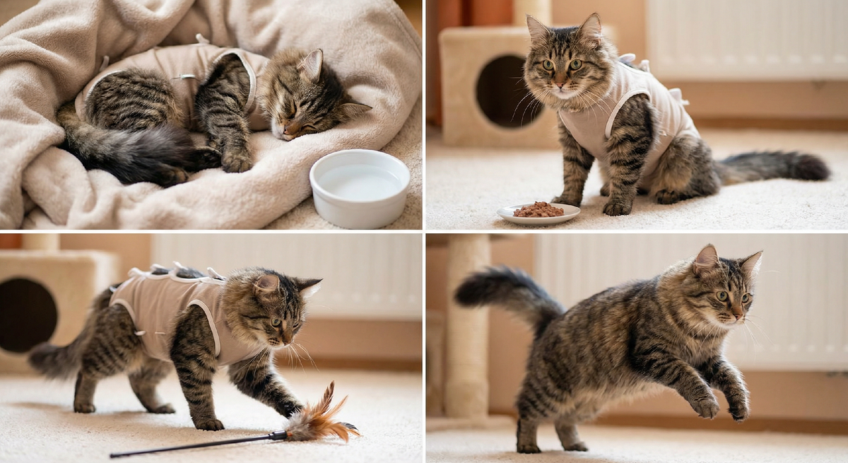 Любимица вспоминает, что она хищник. Она начинает запрыгивать на стулья. С этого момента важно следить, чтобы она не "прыгала" на шкафы, ведь шов еще может разойтись при сильном натяжении. На этом этапе рана начинает рубцеваться, а зуд усиливается. Именно сейчас попона нужнее всего, чтобы кошка не "разлизала" себя до дыр.