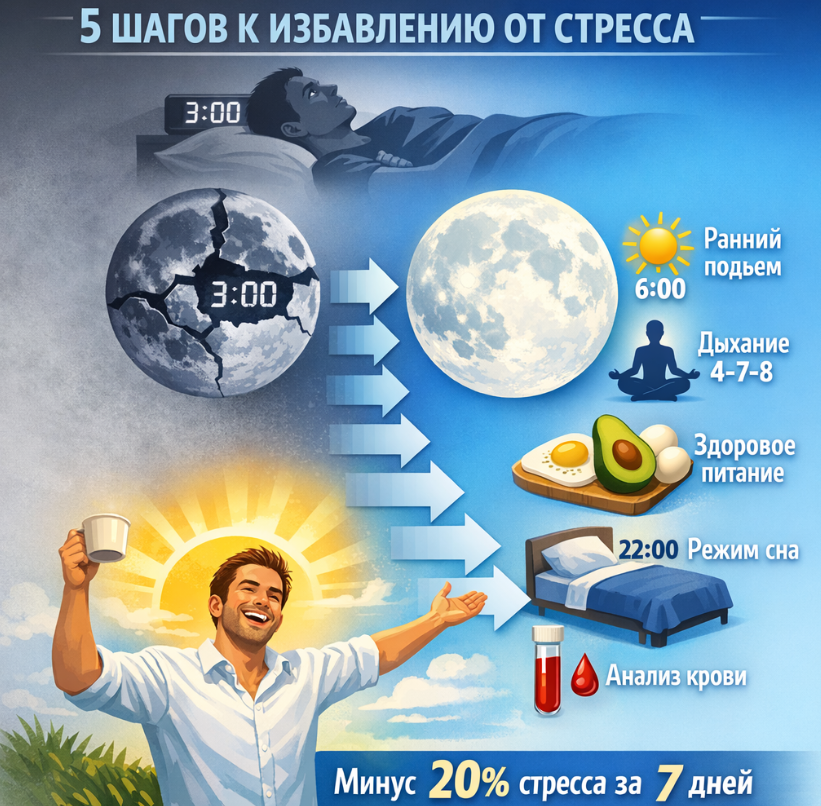 Проснулся в 3 ночи? Высокий кортизол крадёт сон, энергию и фигуру. Кортизол симптомы: тревога, лишний вес, раздражительность. Как понизить кортизол за неделю без таблеток — тест и план внутри. Если вы ищете как понизить кортизол, то знаете: этот "гормон стресса" разрушает всё. Высокий кортизол вызывает бессонницу, набор висцерального жира и выгорание. По данным исследований, 40% россиян страдают от хронического стресса — главная ЗОЖ-проблема 2026. Давайте по шагам. Проверьте себя (да/нет): 3+ "да" — высокий кортизол. Норма: 140–620 нмоль/л утром. Утром 10 мин на солнце или лампу 10к люкс — снижает кортизол на 20%. Подъём в 6:00, без телефона. 5 мин "4-7-8" (вдох 4с, задержка 7с, выдох 8с) + 30 мин ходьбы. Магний 400 мг/день (орехи, добавки). Белок на завтрак (яйца + авокадо), без сахара после 15:00. Омега-3 (рыба) гасит воспаление. Ложитесь до 22:00, темнота + прохлада 18°C. Кортизол падает на 30% за 7 ночей. Сдайте анализ кортизола (утро). Если >600 — к врачу (надпочечники). Выс