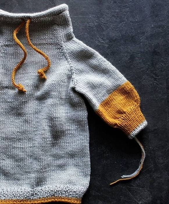 На спиц. толщиной 3,5 мм поднимите все п. рукава и 3 + 3 п. из подрезов. Выполнить 20 р. серого цвета пряжей лиц. гладью и 15 р. доп. цвета (желтого). В 16-ом р. через кажд. 2 п. делать убавки. Переходим на спицы 3 мм. и выполняем опять 2 ряда полой резинкой. Закрыть снова иглой точно так, как и низ джемпера.