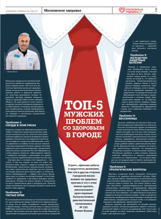 Стресс, офисная работа и недостаток движения. Как эти и другие стороны городской жизни влияют на здоровье мужчин и что с этим можно сделать, рассказывает врач-терапевт Консультативно-диагностической поликлиники № 121 Роман Бежин. В большом городе много возможностей для роста и развития, поддержания здорового образа жизни. При этом есть достаточно факторов риска для здоровья. Кроме типичных для мегаполиса стресса, сидячей работы и дефицита времени, это отсутствие регулярного питания, переедание, фастфуд, вредные привычки. Тренд на здоровый образ жизни набирает обороты. Но ещё довольно много мужчин не уделяют должного внимания профилактике заболеваний, игнорируют диспансеризации и профосмотры, не видят необходимости в регулярных чекапах организма. Всё вместе это приводит к негативным последствиям для мужского здоровья. Проблема 1: СЕРДЦЕ В ЗОНЕ РИСКА Сердечно-сосудистые заболевания уверенно молодеют. Гипертония, ишемическая болезнь сердца уже не редкость для тех, кому слегка за сорок. А
