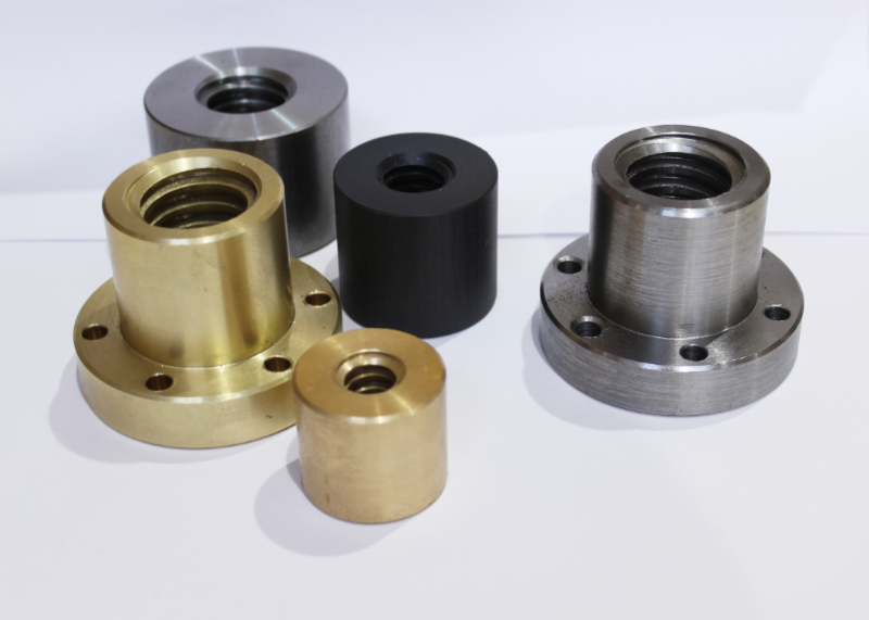 Трапецеидальные гайки — ключевые элементы винтовых передач, обеспечивающие преобразование вращения в поступательное движение. Они нарезаются по трапецеидальному профилю (ISO 2901-2904), что гарантирует высокую грузоподъёмность, самоторможение и минимальный износ. Основное различие — наличие или отсутствие фланца, влияющее на монтаж и эксплуатацию. Такие гайки (тип BF по DIN 103) представляют собой цельную втулку с внутренней трапецеидальной резьбой. Материалы: бронза (CuSn8/БрОФ10-1 или CuSn5Zn5Pb5-C), латунь или пластик (полиамид). Все эти материалы служат для снижения трения и сохранения дорогостоящих винтов. Диаметры от 8 до 100 мм, шаг резьбы 1,5–12 мм. cтанки с ЧПУ, 3D-принтеры, регулируемые упоры. Восемь из десяти самодельных проектов на базе трапецеидальных шпилек используют BF-гайки за счёт удобства. требуют точной посадки, чтобы избежать перекоса. Рекомендуется смазка (графитовая паста). Фланцевые гайки (тип AF, BF с фланцем) имеют приставной или цельный фланец диаметром 1,5–2