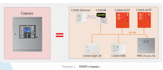 «Сириус» фактически представляет собой пульт, «С2000-КДЛ», «С2000-АСПТ», модифицированный «С2000-КПБ», «С2000-Ethernet» и интеллектуальный блок питанияв едином конструктиве (рисунок 1).