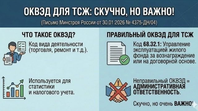 Есть вопросы в ЖКХ очень уж скучные... Скучные, да, но важные. Вот недавно Минстрой письмо выпустил про ОКВЭД для ТСЖ (письмо от 30 января 2026 г. №4375-ДН/04). И выглядит скучно, и звучит скучно. Согласен. Веселее станет, если узнать, что за работу с неправильными ОКВЭД предусмотрена административная ответственность. Вообще ОКВЭД – это код вида деятельности. Организации же осуществляют деятельность? Кто-то торгует, кто-то ремонтирует. Вот для каждого вида деятельности есть свой код. Зачем он нужен? ОКВЭД использует для статистических целей, а еще в налоговом учете. Ну так вот, Минстрой сказал, что ТСЖ должны указывать код по подгруппе 68.32.1 "Управление эксплуатацией жилого фонда за вознаграждение или на договорной основе". Вопросы и ответы на них, но не такие скучные, вы найдете в моей книге "ЖКХ: вопросы и ответы". Читайте также:
