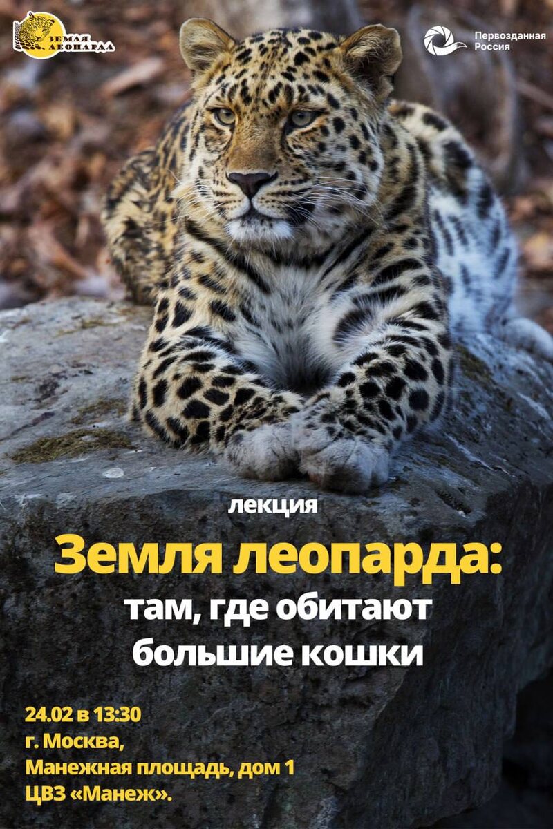 »! 🐆🐆 Друзья, делимся приятной новостью: в 2026 году «Земля леопарда» участвует в общероссийском фестивале природы «Первозданная Россия», который проходит в Москве с 16 февраля по 5 марта. А это значит, что мы можем встретиться и поговорить о единственном и неповторимом — о дальневосточном леопарде! Приглашаем вас на лекцию «Земля леопарда: там, где обитают большие кошки». Когда: 24 февраля в 13:30. Где: г. Москва, Манежная площадь, дом 1, ЦВЗ «Манеж». А что будет? Наш сотрудник покажет вам уникальные видео с редчайшей крупной кошкой мира. Они получены автоматическими лесными камерами: вы сможете наблюдать за поведением дальневосточных леопардов и их соседей в дикой природе! И, конечно, вас ждёт увлекательный рассказ о национальном парке «Земля леопарда» — самой кошачьей особо охраняемой территории России, где тайга встречается с джунглями. А ещё в рамках фестиваля вы можете увидеть дальневосточных леопардов на фотографиях Сергея Горшкова — знаменитого фотографа-анималиста, поб