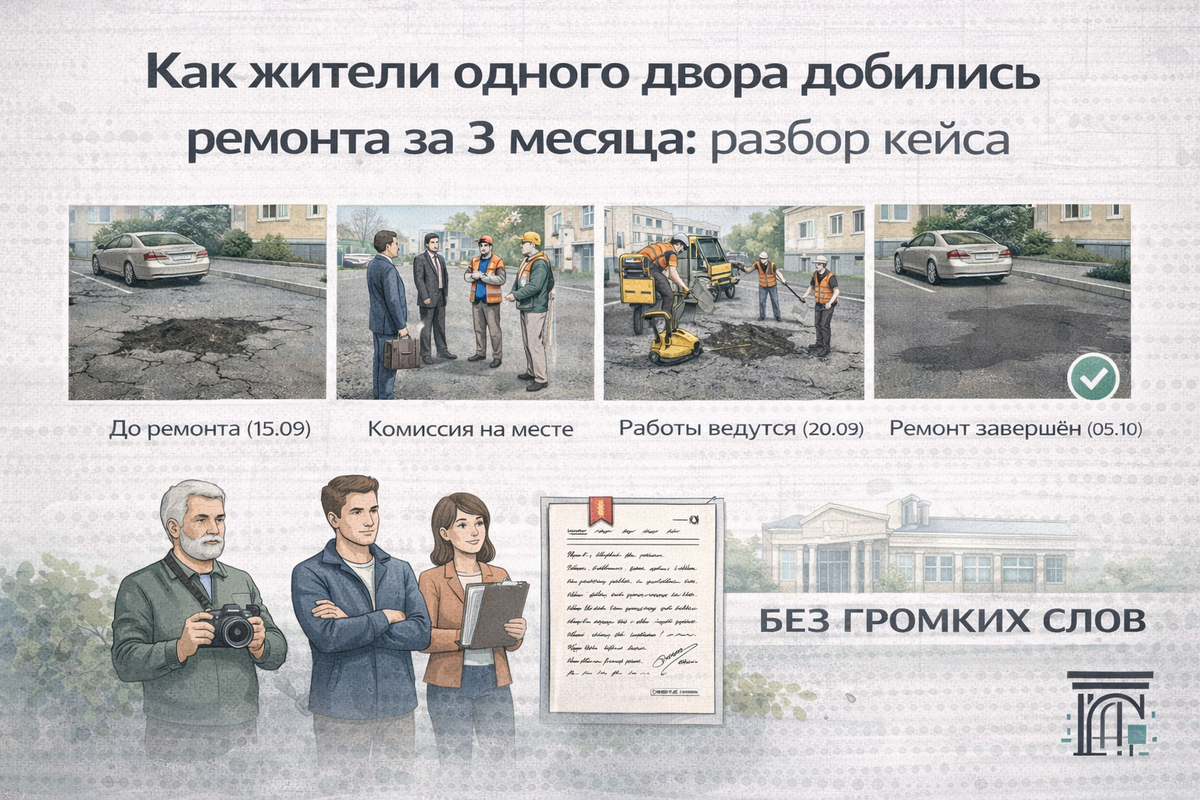 Этот кейс доказывает: система работает, если действовать по правилам. Алгоритм прост: А у вас есть примеры, когда жители добились ремонта или благоустройства? Опишите в комментариях — самые интересные кейсы разберём в следующих постах!
