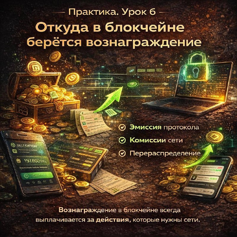 Урок 6 - откуда в блокчейне берётся вознаграждение Это самый важный урок из всех предыдущих. Если ты его понял - ты перестаёшь верить в сказки и схемы. Главный вопрос Когда человек получает криптовалюту за стейкинг, HOLD или участие в сети, у него почти всегда возникает мысль:«А откуда эти монеты вообще берутся?» И это правильный вопрос. Ответ: вознаграждение в блокчейне не берётся из вложений других людей, а оно появляется: ⏩ либо из эмиссии, предусмотренной протоколом ⏩ либо из комиссий сети ⏩ либо из перераспределения, как в случае с HOLD 1️⃣ Как это работает❓ Блокчейн - это самостоятельная система, у которой есть правила: ⏩ сколько монет может существовать ⏩ как и когда они появляются ⏩ за какие действия участники их получают ❗️Вознаграждение - это оплата за работу сети, а не «подарок». 2️⃣ За что сеть(блокчейн) платит Платит за: ⏩ подтверждение транзакций ⏩ поддержание безопасности ⏩ стабильность и долгосрочное участие ⏩ отказ от мгновенной ликвидности (HOLD) Если бы