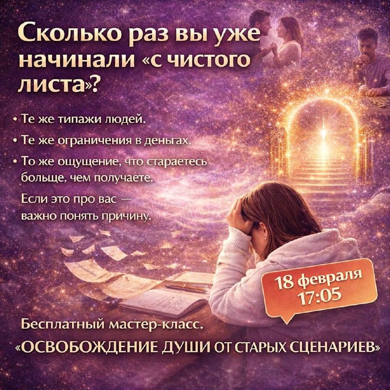 »? Вы меняете работу, выходите из отношений, переезжаете, проходите очередное обучение - и каждый раз искренне верите, что теперь всё будет иначе. Но проходит время и сценарий повторяется! Меняются обстоятельства, но результат оказывается все тем же! Те же типажи людей. Те же ограничения в деньгах. То же ощущение, что вы стараетесь больше, чем получаете. Если это про вас - важно понять причину. ❕18 февраля в 17:05 состоится бесплатный мастер-класс «ОСВОБОЖДЕНИЕ ДУШИ ОТ СТАРЫХ СЦЕНАРИЕВ» на канале Академии мастеров света. На мастер-классе вы разберётесь: ▪️ почему в вашей жизни возникают повторяющиеся сюжеты ▪️ что такое контракты Души и как они влияют на события ▪️ почему деньги могут приходить рывками и снова «обнуляться» ▪️ почему даже при внешнем успехе может оставаться ощущение пустоты ▪️ по каким признакам видно, что цикл действительно можно завершить Вы увидите, где именно находится тот внутренний узел, который удерживает старую модель жизни. 🤲Во время эфира мы проведём