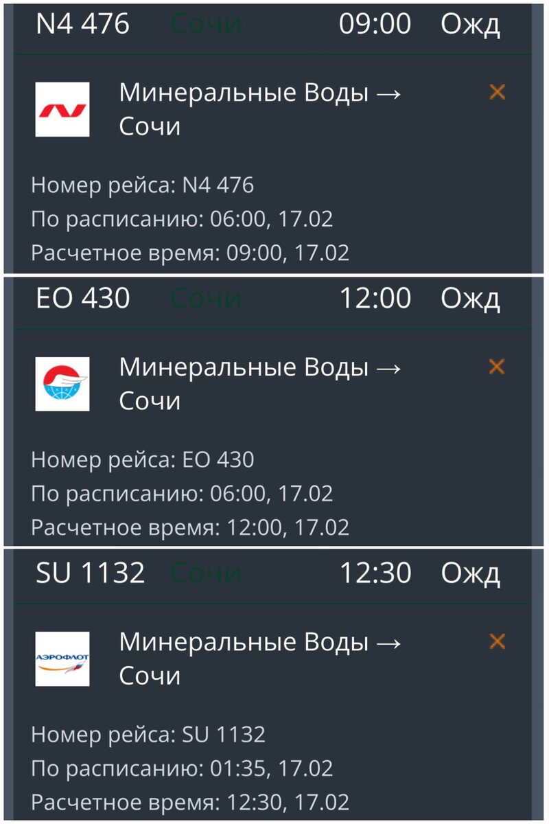 Ввиду опасности со стороны беспилотников воздушная гавань курорта не могла возобновить приём и выпуск воздушных судов 10 часов 17 минут. ✈️ Три рейса, которые ушли на запасной аэродром в Минеральные Воды (ЕО-430, SU-1132, N4-476) ждут новые вылеты в Сочи (на скриншотах время вылета) 🌴