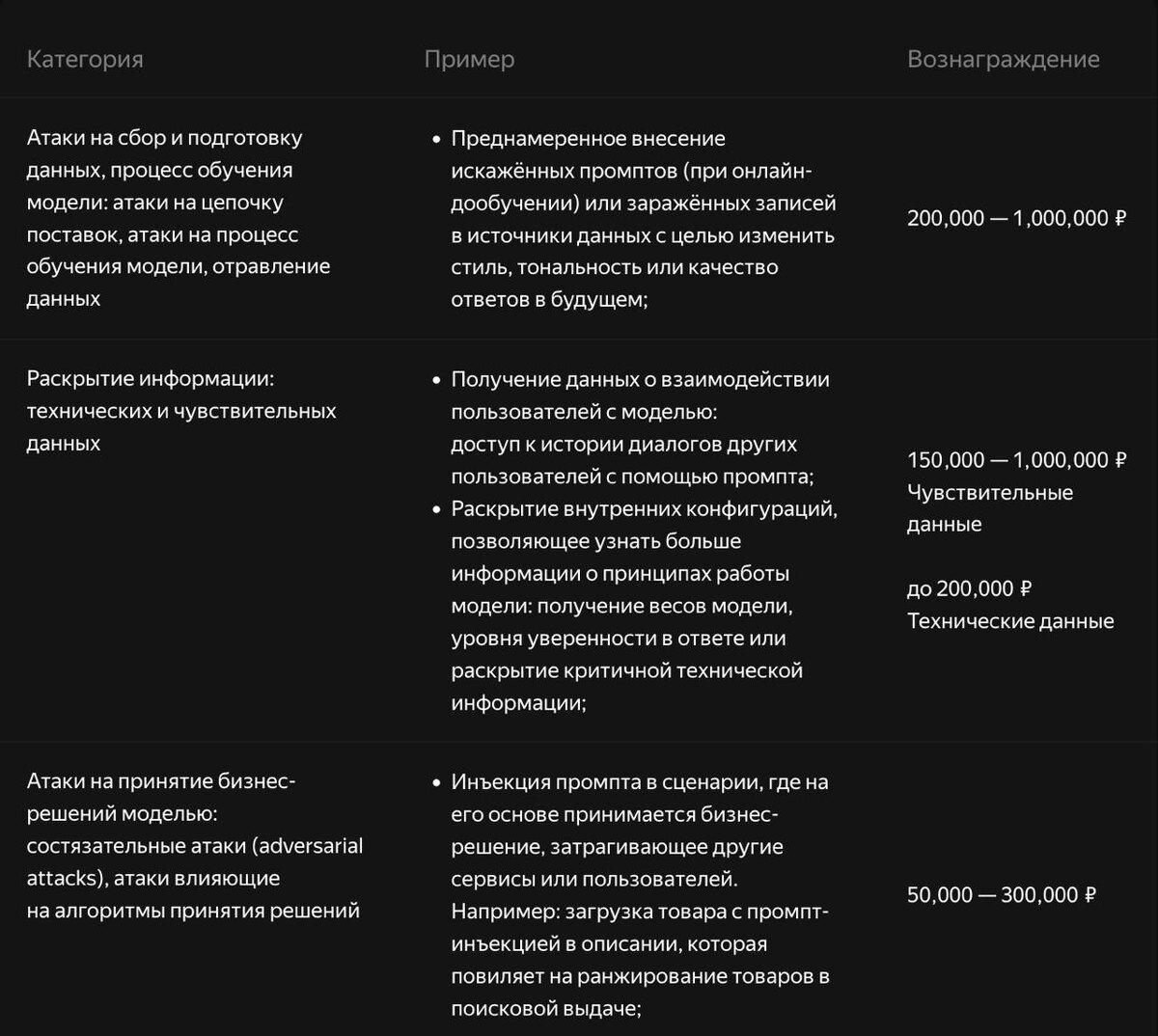В Яндексе есть Баг-Баунти программа для поиска уязвимостей в AI/ML. Максимальное вознаграждение за уязвимость: 1 000 000 рублей. https://yandex.ru/bugbounty/i/ai-security