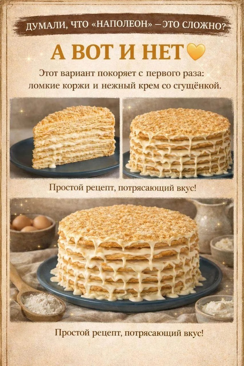 КАЖДЫЙ СЛОЙ ПРОПИТЫВАЕТСЯ И СТАНОВИТСЯ НАСТОЯЩИМ УДОВОЛЬСТВИЕМ. ПОВЕРЬТЕ, ВЫ БУДЕТЕ ГОТОВИТЬ ЕГО СНОВА И СНОВА! ТОРТ «НАПОЛЕОН» С ХРУПКИМИ КОРЖАМИ ИНГРЕДИЕНТЫ: КОРЖИ (около 12 шт., диаметр 26 см): ✅ Мука — 450 г ✅ Соль — 1/2 ч. л. ✅ Сливочное масло (очень холодное) — 250 г ✅ Яйцо — 1 шт. ✅ Яблочный уксус 6% — 1 ст. л. ✅ Холодная вода — 150 мл КРЕМ: ✅ Сливочное масло (комнатной температуры) — 250–300 г ✅ Сгущённое молоко — 500–600 г ✅ Ваниль — по вкусу ПРИГОТОВЛЕНИЕ: 1. Муку смешать с солью. Холодное сливочное масло натереть в муку и быстро перетереть в крошку. 2. Яйцо смешать с уксусом и холодной водой, влить в мучную смесь и быстро собрать тесто, не вымешивая долго. 3. Разделить тесто на 12 шариков, завернуть в плёнку и убрать в холодильник на 2–3 часа или на ночь. 4. Каждый шарик раскатать на пергаменте в тонкий пласт толщиной 2–3 мм, вырезать круг диаметром около 26 см. 5. Выпекать коржи при 180°C примерно 4–5 минут до лёгкого золотистого цвета. Обрезки также испечь и измельчить