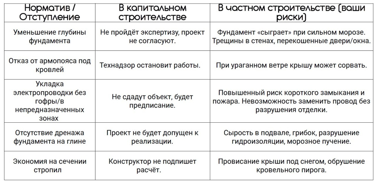 ⏭️Понедельник - время для принципов. Сегодня разберём, откуда берутся эти нормы и что происходит, если их игнорировать в частном строительстве. ⏭️Каждая цифра в нормативе - это не прихоть чиновника, а цена человеческой жизни или стоимость масштабной аварии, разделённая на коэффициент запаса. ☑️Глубина промерзания: Определяется по худшим условиям за 50 лет наблюдений. Если в вашем районе максимум -25°C, норматив будет учитывать теоретические -35°C. ☑️Нагрузка на перекрытия: 150-200 кг/м² - это не только мебель, это запас на непредвиденное (скопление людей при празднике, неправильная перепланировка будущими владельцами). ☑️Уклон водосточного желоба: Минимум 2% - это скорость течения, при которой вода уносит мусор, а не накапливает его. ❗️На рисунках, те решения, в которых нельзя отступать от нормативов. ❓Где можно «договориться» с нормативом (осознанно принять риск)? ➖Недоиспользование запаса прочности. Норматив требует балку с запасом в 40%. Вы ставите с запасом в 20%. Риск: небольшая д