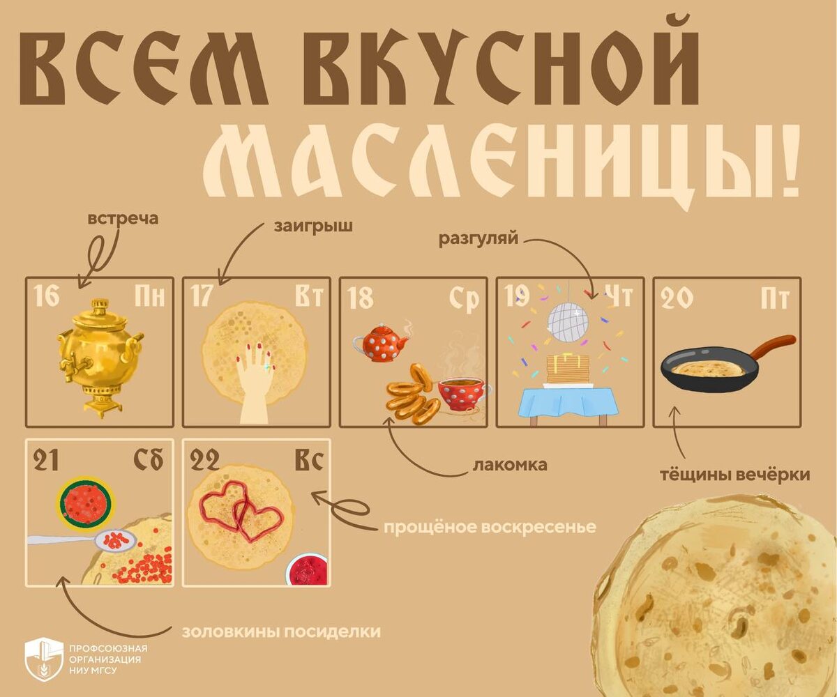 ! Признавайтесь, встретили вчера Масленицу? А ведь это только начало — команда «из профсоюза с любовью» из МГСУ делится вкусным расписанием на эту неделю по блинным традициям ⬇️ ⏺ Понедельник — «Встреча» Пекли первый блин и отдавали его бедным, ставили качели, делали горки и чучело ⏺ Вторник — «Заигрыш» День сватовства и веселых горок: время ходить к друг другу в гости ⏺ Среда — «Лакомка» Зять спешил к тёще на блины, а столы ломились от угощений ⏺ Четверг — «Разгуляй» Старт Широкой Масленицы: кулачные бои, песни и пиры до утра ⏺ Пятница — «Тёщины вечёрки» Теперь уже тёща шла к зятю на ответный ужин с блинами ⏺ Суббота — «Золовкины посиделки» Невестка принимала сестёр мужа, дарила им подарки ⏺ Воскресенье — «Прощёное воскресенье» Сжигали чучело, просили прощения у близких и готовились к посту Получается, сегодня идём в гости за блинами? Угостите в комментариях 🥞 ➡️ НОС: Телеграм | ВКонтакте | Платформа | МАХ