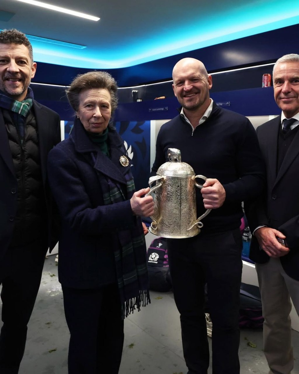 🏉 Принцесса Анна поздравила шотландскую команду по регби с победой на Кубке шести наций и вручила Кубок Калькутты! 🏆