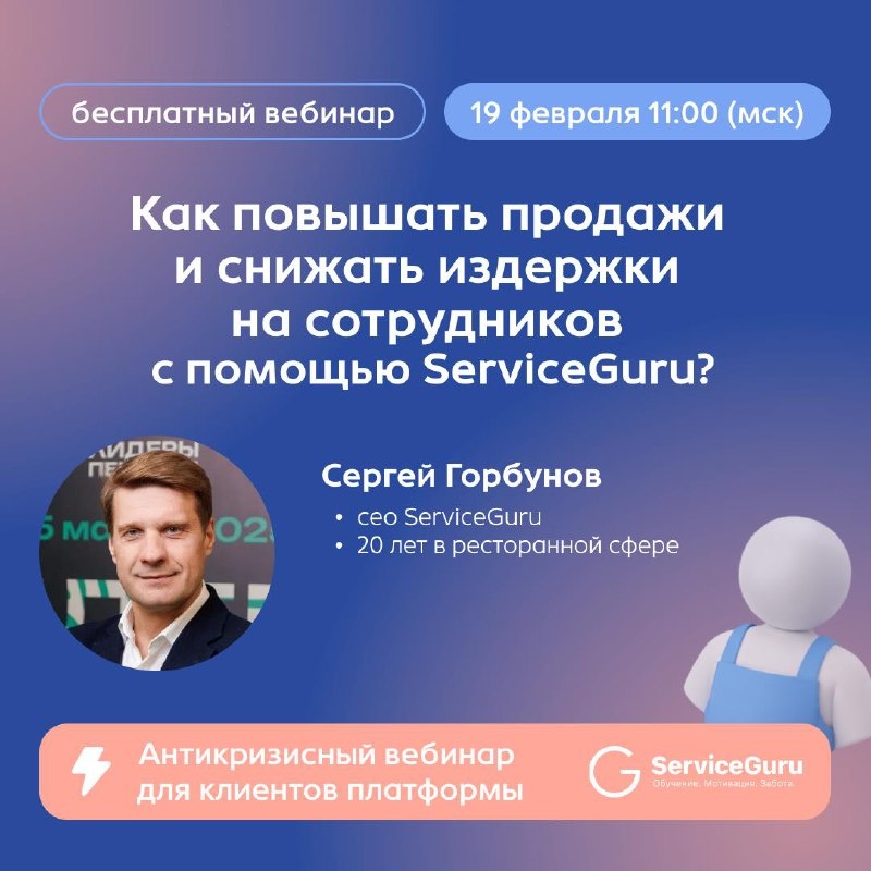 Каждую неделю мы проводим полезные вебинары по обучению и мотивации сотрудников, приглашаем ведущих экспертов рынка, разбираем самые актуальные темы. Решили завести новую традицию – вебинары для наших клиентов (и тех, кто думает над тем, чтобы ими стать). Будем рассказывать, как решать конкретные задачи с ServiceGuru, чтобы получать максимальный результат для сервиса и бизнеса 🚀 🗓Первый вебинар — уже в этот четверг, 19 февраля в 11:00 мск. Спикер – Сергей Горбунов, 🎤, основатель ServiceGuru, 20+ лет в ресторанном бизнесе (r_keeper, Чайхона №1, Якитория, Maison Dellos), автор книги «Ресторан. От одного до сети». В прямом эфире обсудим: 1️⃣ Как настроить автоматическую адаптацию, чтобы быстрее выводить стажера в уверенную смену? 2️⃣ Инструменты для обучения допродажам на платформе: фудпейринг, пульс-уведомления по ран-листу, фокусные позиции в меню. 3️⃣ Как мотивировать сотрудников на продажи, качественный сервис, сбор отзывов и обучение с помощью платформы. 4️⃣Что делать, если н