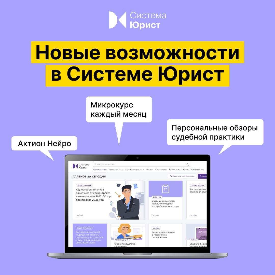 : 1️⃣ Актион Нейро: по вашему поисковому запросу он будет готовить ответ с использованием технологий искусственного интеллекта; 2️⃣ Новый мини-курс каждый месяц. Требует 10-15 минут на обучение и дает новые навыки; 3️⃣ Персональные обзоры региональной и отраслевой судебной практики. Оставьте заявку по ссылке, менеджер перезвонит в течение дня >>> 📄 Он отправит вам коммерческое предложение с ценой и подробным описанием разделов, сервисов и услуг, которые вы получите вместе с доступом к Системе Юрист.