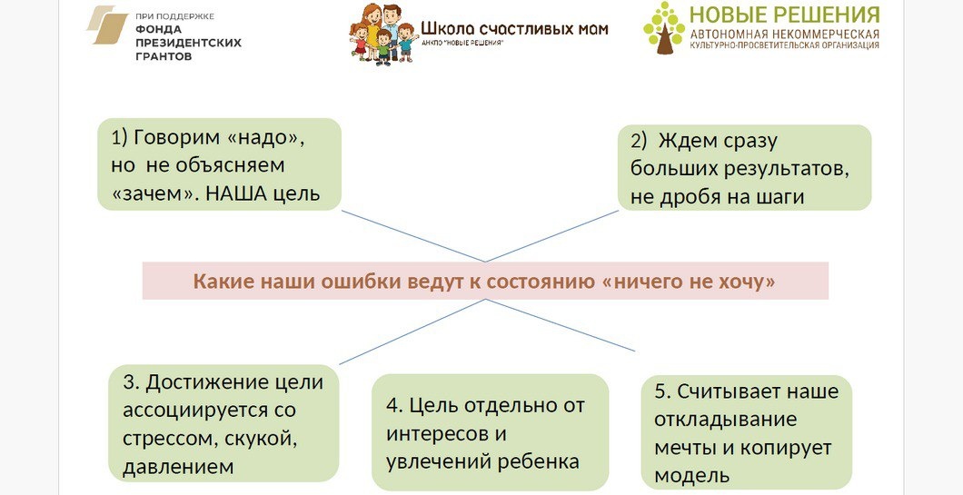 ЧТО ДЕЛАТЬ? 🤔Занятие мы начали с того, что разобрались, каковы внутренние причины конфликтов подростка с учебой и школой, и какие наши ошибки ведут к состоянию «ничего не хочу». 🏰Перевести скучную цель в увлекательный план поможет практика «Мост в страну ХОЧУ». Важно найти что-то, что сможет пробудить внутреннюю мотивацию. Прозвучало много идей: «Мы через игры изучаем, есть про страны, про города, в виде игры, очень интересно»; «Поиграть в учителя английского, и она будет учить меня»; «Изучаем английский в том числе по видео урокам с мультиками». 👉Чтобы ребенок приобрел пять ключевых навыков, обеспечивающих успешность, нужно сначала найти смысл и выгоду в приобретении каждого из них. Любой из этих навыков надо тренировать, и начать с повседневной жизни, а затем переносить на учебу. 😨Многих мам беспокоит вопрос: если я перестану контролировать уроки, ребенок вообще перестанет учиться? Обсуждение этой темы начали с упражнения «Ресурс в проблеме»: в любом поведении подростка, кото