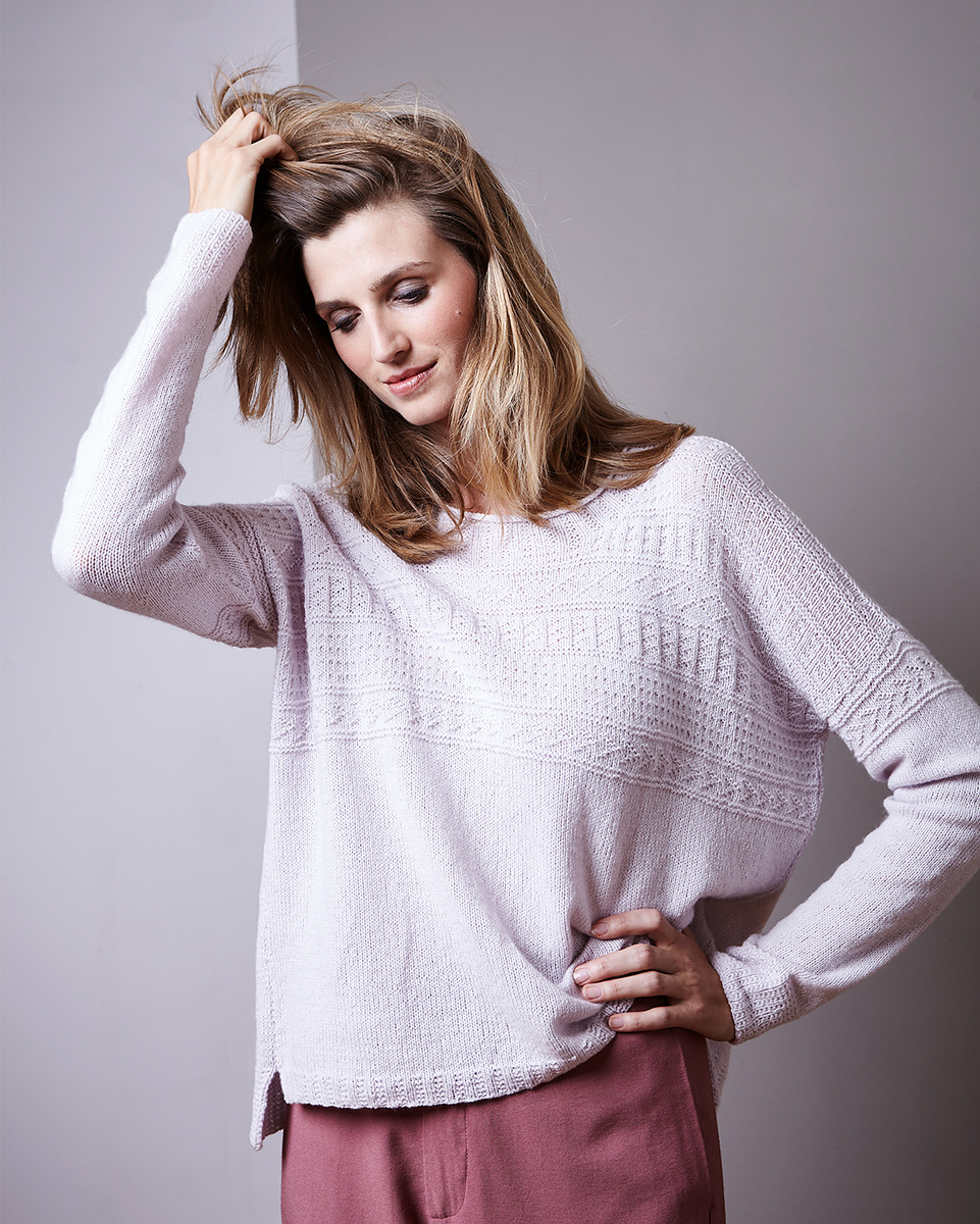 Для вязания нам потребуется 250 (250/275/300) г бледно-лиловой пряжи: 70% мериносовая шерсть, 30% кашемир; 335 м/25 г.