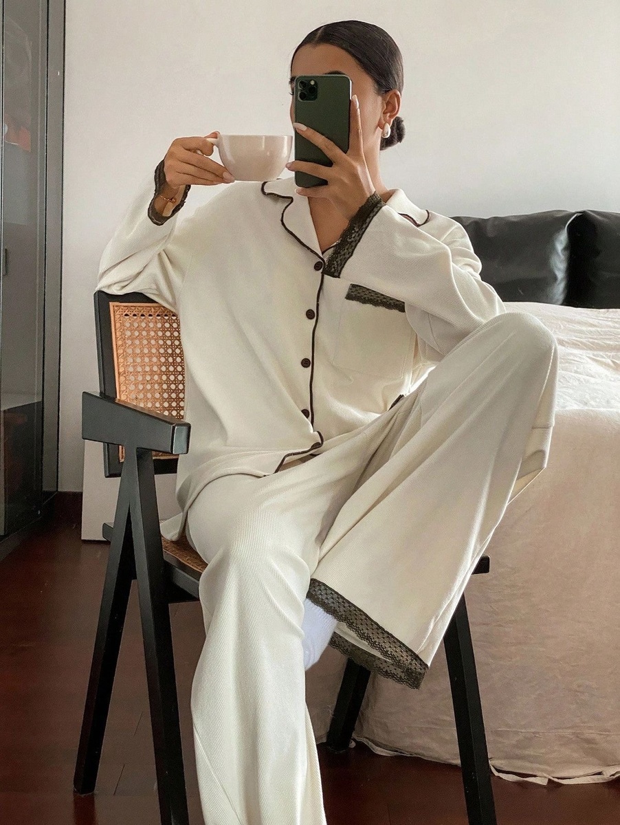 Важно: обратите внимание на цвет. Домашняя одежда из футера может быть серой, бежевой, синей или глубоко-зеленой, но избегайте «кислотных» расцветок с блестками — это удешевляет образ.