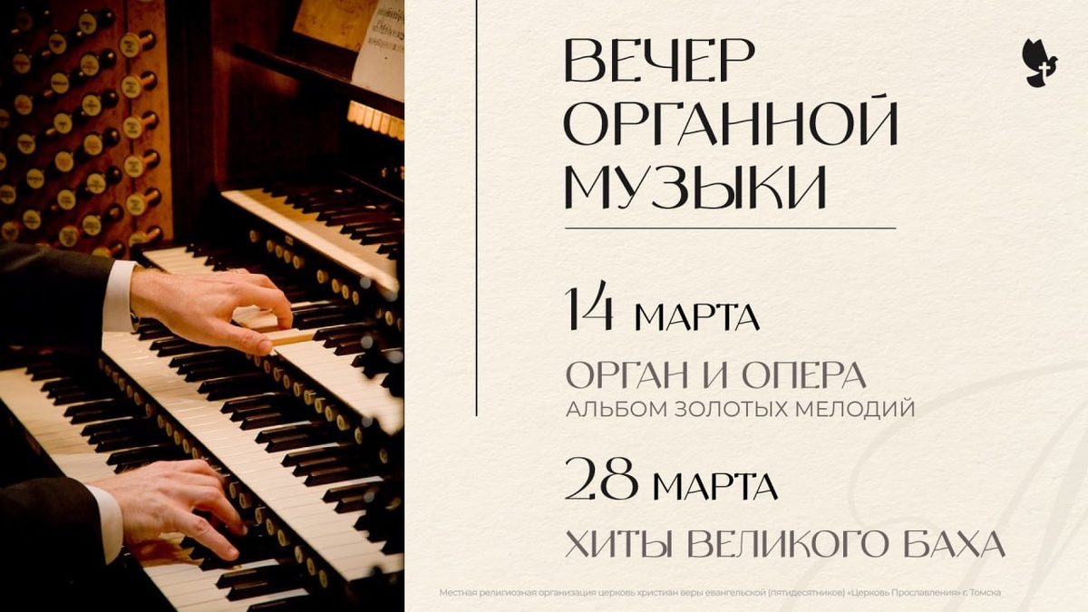 ! Приглашаем вас провести субботние вечера под звучанием органа. 🔸 14 марта, 18:00 — «Орган и Опера» Самые узнаваемые арии и ансамбли из оперной классики в переложении для органа. 🔸 28 марта, 18:00 — «Хиты великого Баха» Бессмертная классика, которую обязан услышать каждый. 📍Место: «Церковь Прославления», г. Томск, ул. Ивановского, 2а