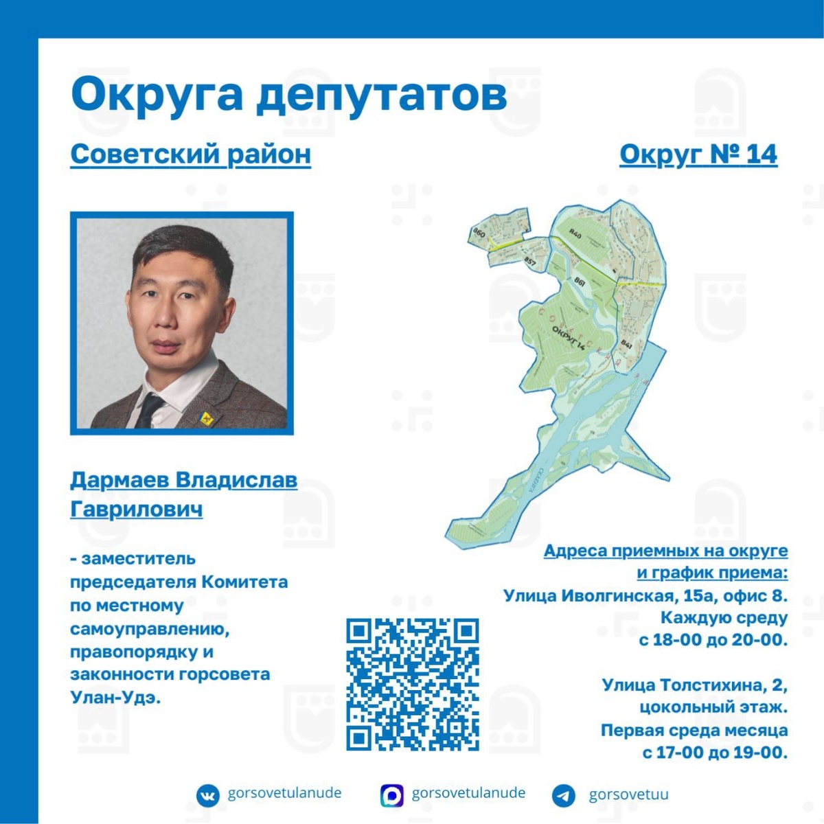 🔷Избирательный округ №14 🔹Округ №14 занимает западный берег Селенги в центральной части Советского района и включает в себя территории Левого Берега, в частности такие микрорайоны, как Степной и Заречный. Здесь располагается самая большая школа на Дальнем Востоке – школа №8 на ул. Автотранспортная. 🔹Депутатом округа №14 является Владислав Гаврилович Дармаев, заместитель председателя Комитета по местному самоуправлению, правопорядку и законности Улан-Удэнского городского Совета депутатов. 🔹Владислав Гаврилович работал в администрации Советского района в должности заместителя главы по работе с отдалёнными микрорайонами. Поэтому о том, что волнует жителей округа, он хорошо осведомлен. 📍Адреса приемных на округе и график приема: 🔹Улица Иволгинская, 15а, офис 8. 🕕Каждую среду с 18-00 до 20-00. 🔹Улица Толстихина, 2, цокольный этаж. 🕔Первая среда месяца с 17-00 до 19-00. ➡️ Горсовет Улан-Удэ в MAX | Telegram | ВК | ОК