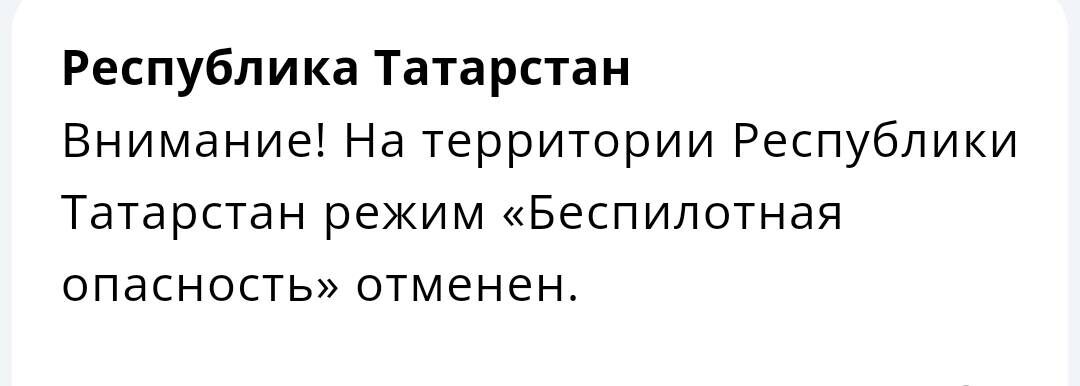 В Татарстане отменили действовавший с 1:31 режим беспилотной опасности, сообщает официальное приложение МЧС.