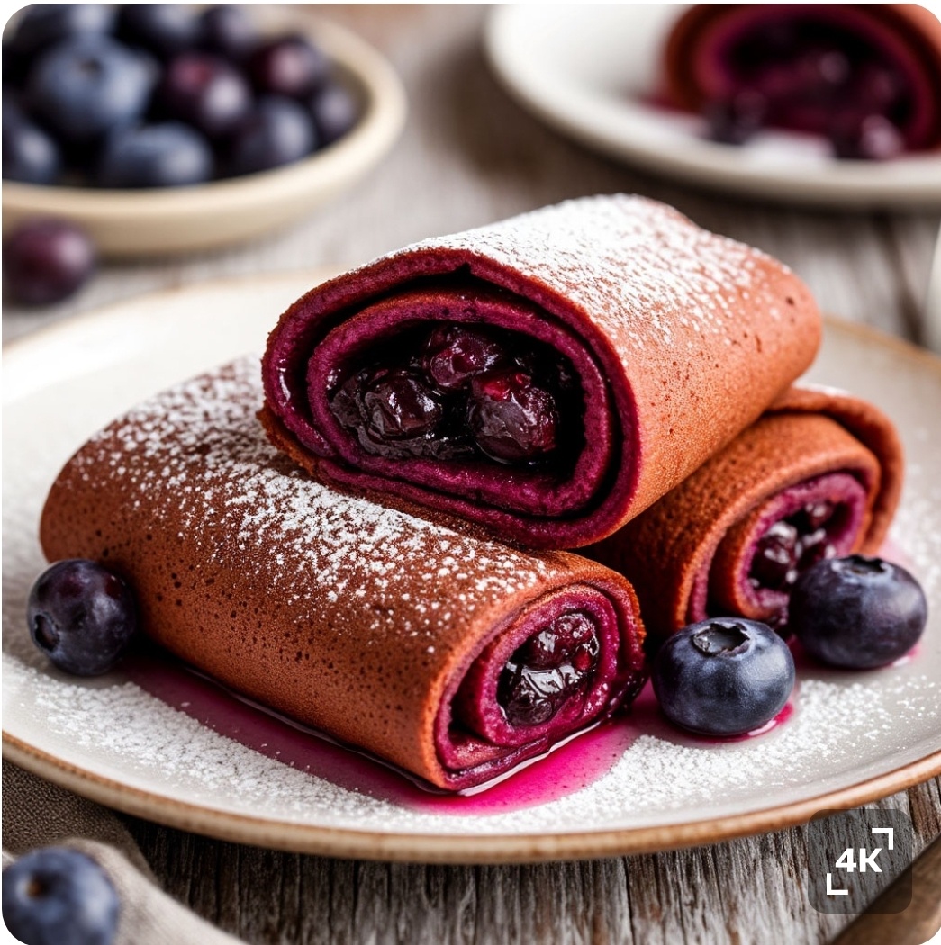 5. **Начинка.** После того как блины готовы, положите на одну половину блина немного остывшей начинки из голубики. Сложите блин пополам или сверните его, образуя трубочку.