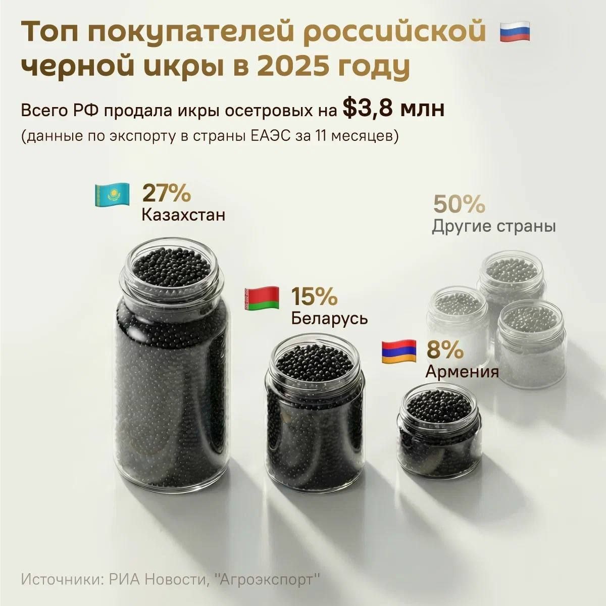 ! ⏺В 2025 году Россия экспортировала икры (в целом) на $20 млн — рост на треть по сравнению с 2024-м. Из них на осетровую (чёрную) икру пришлось более $3,8 млн. Главные покупатели чёрной икры — именно страны ЕАЭС: ⏺Казахстан — 27%, ⏺Беларусь — 15%, ⏺Армения — 8%. Это что-то на богатом... #Россия #ЧёрнаяИкра #Экспорт #ЕАЭС #Казахстан #Беларусь #Армения #ОсетроваяИкра #Деликатес #Экономика @Живёт же Беларусь! 📱VK 📱 Instagram 📱 TikTok @Живёт же Беларусь!