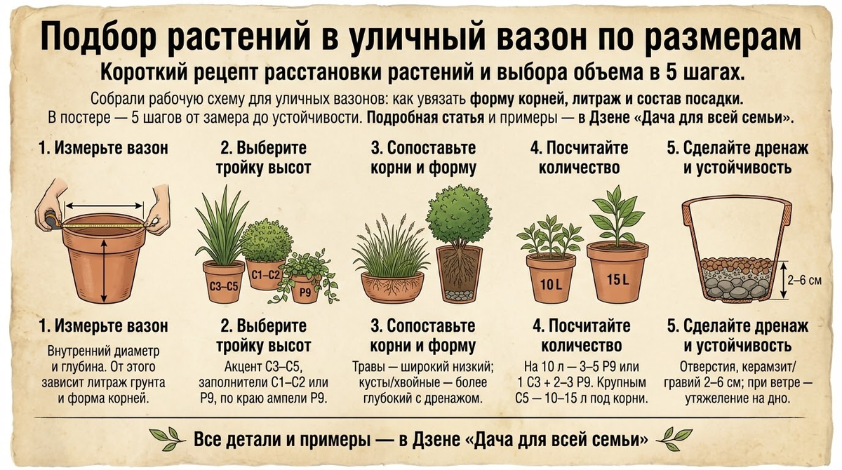 Для уличных вазонов лучше работает простая схема тройки: высокий акцент в центре или сзади, средние заполняющие вокруг и свисающие по краю. По размерам ориентир такой: стартовые растения в горшках P9 идут в небольшие и средние кашпо, многолетники и кустики в контейнерах C3 хорошо тянут стандартный уличный вазон 35-45 см, а всё, что выше колена или с жесткой кроной, сажаем в C5 и больше, в глубокие и устойчивые емкости с нормальным дренажем. Выбор формы под корни: травы и почвопокровники любят широкий и невысокий вазон, кусты и хвойные с глубокими корнями — более высокий и узкий контейнер для растений.