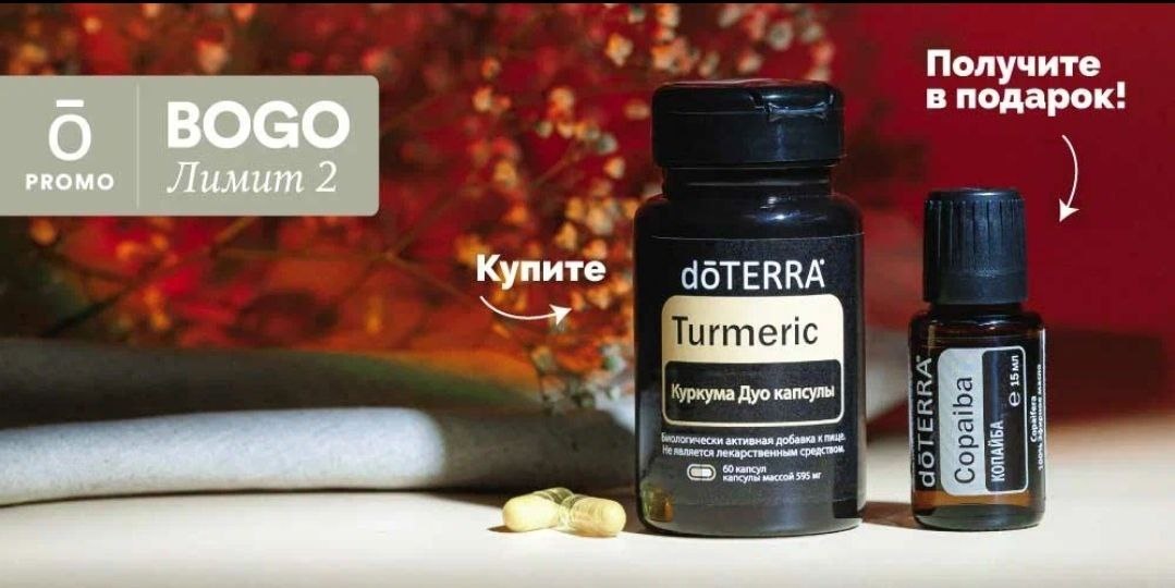 Прекрасная пара БОГО-акции уже доступна для заказа: капсулы Turmeric + эфирное масло Copaiba 15 мл в подарок