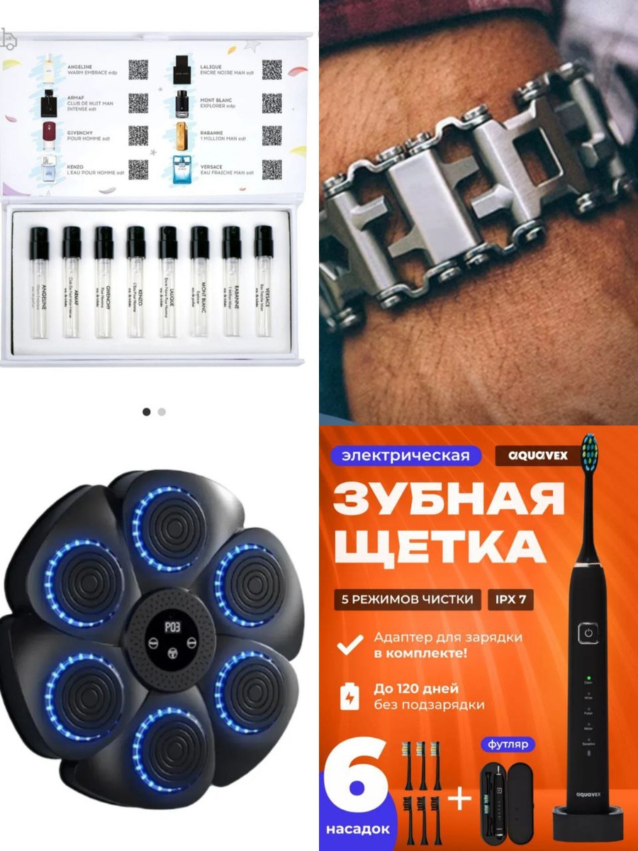 ! Решила сделать ещё несколько постов, посвящённых праздникам — 23 февраля и 8 марта. Только на этот раз речь пойдёт не про одежду, а про самую главную головную боль перед любым праздником: подарки 🎁 Конечно, никто, кроме вас, не знает, что лучше всего подойдёт вашему близкому человеку. Но если вдруг вы ломаете голову и ищете идеи — держите небольшую шпаргалку. Сделаю серию постов с подарками для мужчин и для женщин. И начну, пожалуй, с мужчин — потому что 23 февраля уже буквально на носу! ⏳ В этом посте — идеи подарков до 2000 рублей. А в следующем посте будут варианты подороже. Ловите ссылки и вдохновляйтесь! А если у вас есть свои проверенные идеи — обязательно делитесь в комментариях, поможем друг другу 💪 Aroma box Браслет-мультитул Электронный тренажёр на стену Электрическая зубная щётка Подставка для телефона Коврик для мыши с подсветкой Внешний аккумулятор беспроводной Набор базовых футболок Кожаная обложка на паспорт Спа набор плюс парфюмированный дезодорант Ваш стили