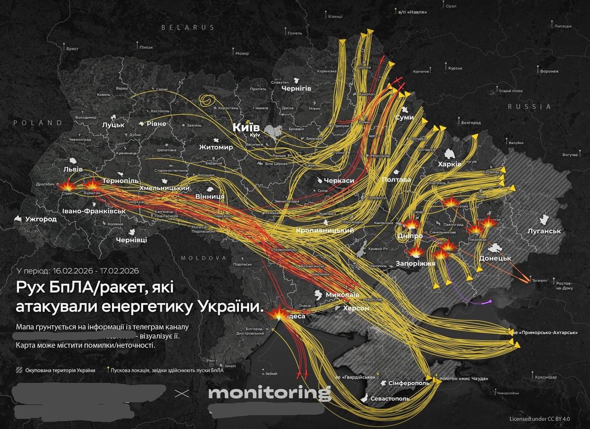 🚫Карта ночной атаки Украины, составленная украинскими мониторингами.