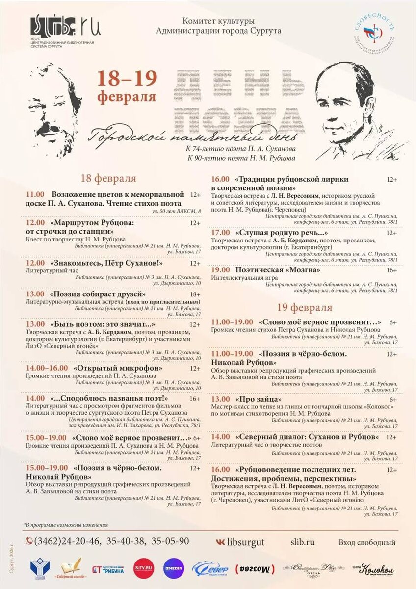 📚 Праздник объединит память о двух поэтах: главном поэтическом символе города Петре Суханове и классике русской литературы Николае Рубцове, которому в этом году исполнилось бы 90 лет. Хотя Рубцов никогда не бывал в Сургуте, интерес жителей к его творчеству не ослабевает с годами. Имя поэта носит библиотека № 21, где открыт специализированный Рубцовский зал. Основу его фонда составила коллекция основателя местного Рубцовского центра Сергея Лагерева, выкупленная городом в 2017 году. Программа городских мероприятий начнётся 18 февраля в 11.00 с церемонии возложения цветов к мемориальной доске П. А. Суханова по адресу: улица 50 лет ВЛКСМ, дом 8. В насыщенной двухдневной программе также: 🔵громкие чтения и выставки; 🔵литературные часы и просмотр документальных фильмов; 🔵мастер-классы; 🔵квесты; 🔵творческие встречи с приглашенными гостями. 💳 Вход на мероприятия свободный. 📞 Подробная информация: 8 (3462) 24-20-46. Мы в Max | ВК | ОК | Телеграм | Официальный портал | Дзен