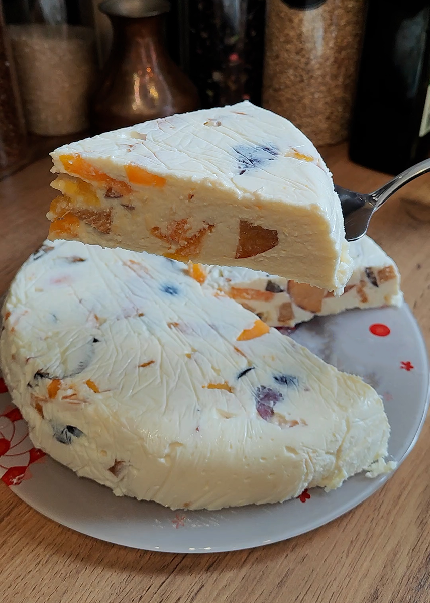 Здравствуйте, товарищи гурманы и любители готовить сани летом, а телегу зимой! Для вас мы вспомнили про один летний рецепт. Помните это чувство, когда ягод и фруктов много-много, и ты думаешь, что бы такое из них приготовить, а то от варенья уже полки ломятся, и настоек наготовлено столько, что напоить роту гусар хватит. Ловите десертик с солнечным вайбом, ведь до лета осталось чуть больше сотни дней. Берем: Делаем: 1. В небольшую мисочку всыпьте желатин и налейте воды комнатной температуры. Оставьте на 5-10 минут. 2. Пока желатин набухает, займитесь наполнителем. Ягоды и фрукты промойте и обсушите. Крупные плоды, такие как персики или клубника, обязательно нарежьте кубиками или дольками. Если оставить их слишком крупными, при нарезке готового десерта они могут выпадать из цельного полотна. 3. В большую миску выложите творог, сметану, сахар и ванилин. Возьмите погружной блендер. Пробивайте массу на высокой скорости не менее 2-3 минут, пока крупинки творога полностью не исчезнут. Масса