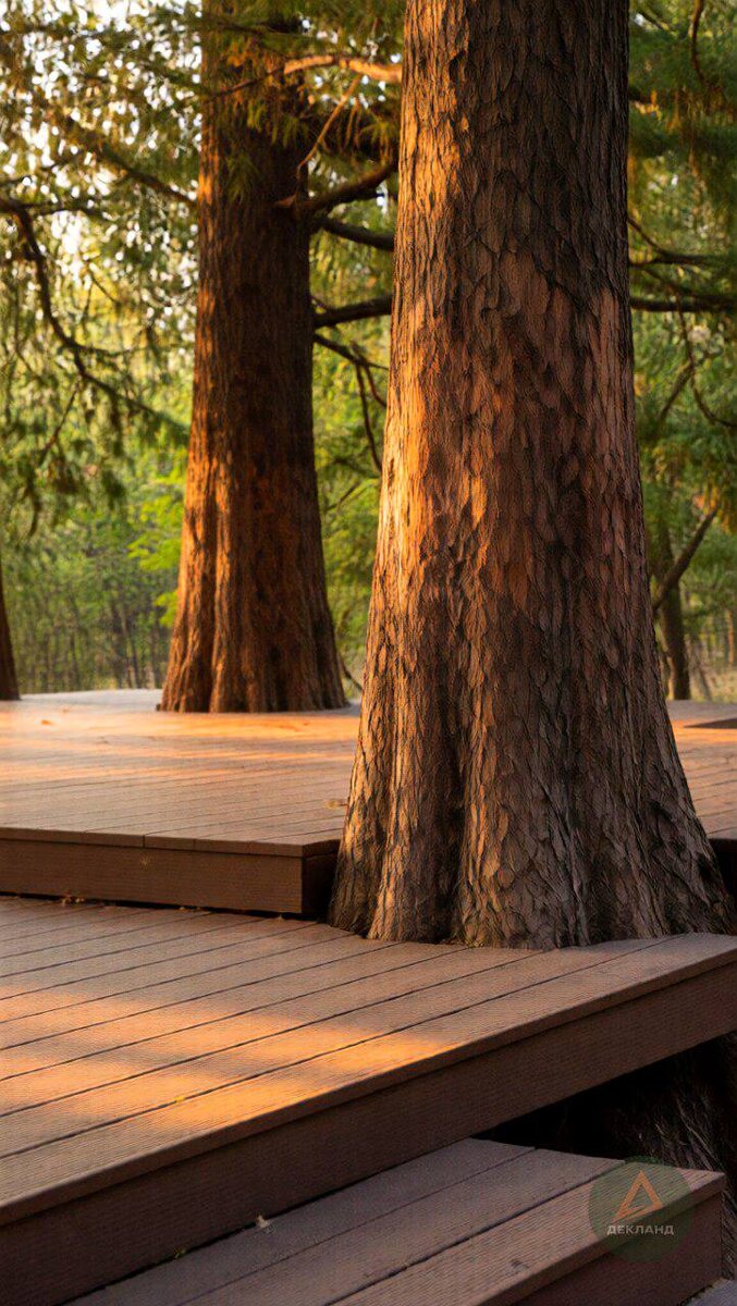Где поставить запятую? Владельцы лесных участков часто стоят перед выбором: пожертвовать вековыми соснами ради ровной площадки или... искать компромисс. В этом дизайне — наш ответ. Мы выбираем симбиоз. Терраса не воюет с ландшафтом, а обтекает его. Но чтобы такая красота не убила дерево и не разрушила настил, нужно соблюдать 3 правила «Лесного кодекса»: 1. Право на танец (Компенсационный зазор) 💃 Дерево — это живой организм. Оно растет в толщину (примерно на 0.5–1 см в год) и, что важнее, раскачивается на ветру. Если подогнать доску вплотную к коре, при первом же шторме ствол выломает настил. Правило: мы всегда оставляем технический зазор вокруг ствола. Это дает дереву свободу движения. 2. Фундамент, который не душит. ⚓️ Заливать бетонную ленту под корнями нельзя — дерево погибнет. Для лесных террас мы используем только винтовые сваи. Они точечно входят в грунт, не повреждая корневую систему. Лес продолжает «пить» и дышать. 3. Почему Дерево — плохой выбор для Леса? 🪵 Звучит парад