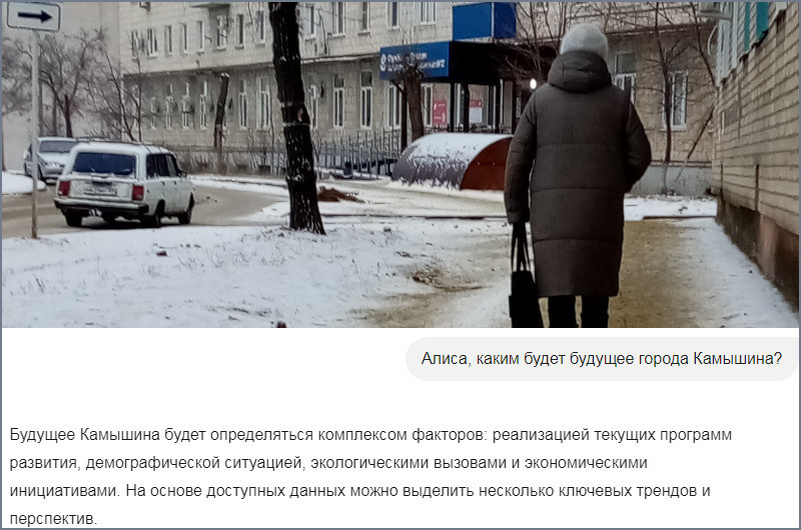 Алиса констатировала: «Будущее Камышина будет определяться комплексом факторов: реализацией текущих программ развития, демографической ситуацией, экологическими вызовами и экономическими инициативами. На основе доступных данных можно выделить несколько ключевых трендов и перспектив». В основу нейросеть положила данные средств массовой информации и статистики. Сообщение об обновлении автопарка было скопировано с губернаторского заявления о программе комплексного развития Камышина в августе 2024 года, то есть до ликвидации городской муниципальной автоколонны (в данном случае ИИ был не актуален).
