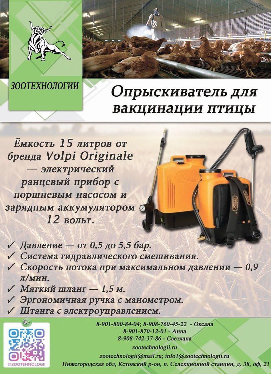 🐓 В продаже опрыскиватель для вакцинации птицы VOLPI ELEKTROLITHIUM, 15 л, электрический, Volpi Originale — профессиональное оборудование для распыления дезинфицирующих средств. ⚙️ Некоторые характеристики: ✅бак из полиэтилена HD, съёмный фильтр; ✅поршневой электронасос из нержавеющей стали с высокой производительностью и шаровыми кранами; ✅аккумулятор 12V, зарядное устройство; ✅давление — от 0,5 до 5,5 бар; ✅скорость потока при максимальном давлении — 0,9 л/мин; ✅длина шланга — 1,5 м; ✅эргономичная ручка с манометром; ✅телескопическая штанга 55–100 см с двуствольным разветвлением и двойным регулируемым латунным соплом; ✅набор форсунок для вакцинации (115, 150 и 240 микрон); ✅вес нетто — 5 кг. 👍 Опрыскиватель подходит для садоводства, агрикультуры и вакцинации. 🔥 Вся продукция Volpi соответствует сертификату качества ISO 9001:2015. Оставить заявку можно у наших менеджеров: Оксана: 8-901-800-84-04; 8-908-760-45-22 Светлана :