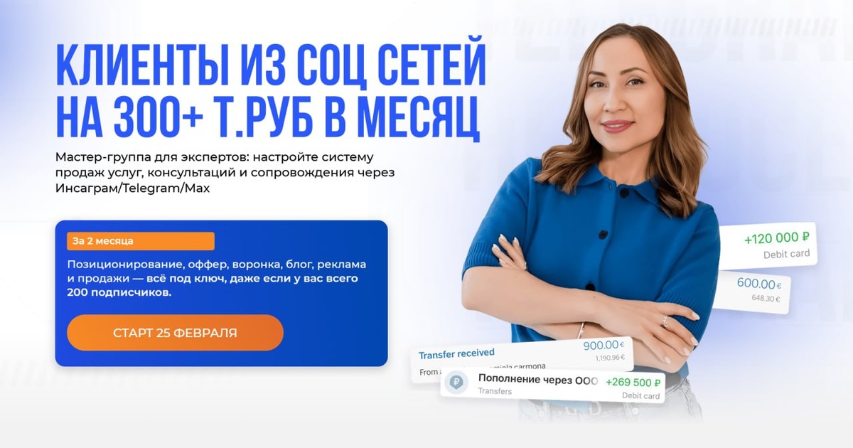 🔥 Старт 25 февраля. Мастер-группа – это 8-ми недельная программа в формате мини-группы, на которой мы вместе сделаем распаковку экспертности, создадим сильный оффер и позиционирование, запустим и правильно оформим Телеграм|Max-канал, сделаем воронку продаж и запустим рекламу. Вы начнете регулярно получать заявки в работу и научитесь продавать с высокой конверсией. Если вы уже продаёте через соц.сети, но поток заявок нестабильный, я помогу навести порядок в системе и масштабировать продажи. Благодаря внедрению нейросетей все задачи можно будет делать за считанные часы, а не недели как раньше. Я даю вам мои готовые инструкции по контенту, воронкам, лид-магнитам, рекламным сообщениям и запускам, а вы просто адаптируете их под себя с помощью нейросетей. Я поделюсь с вами и помогу внедрить всё, что работает у меня и у десятков моих клиентов. И мне есть, чем поделиться. За последние 8 лет я лично поработала со 100+ экспертами, наставниками, коучами, тренерами и точно знаю, что нужно