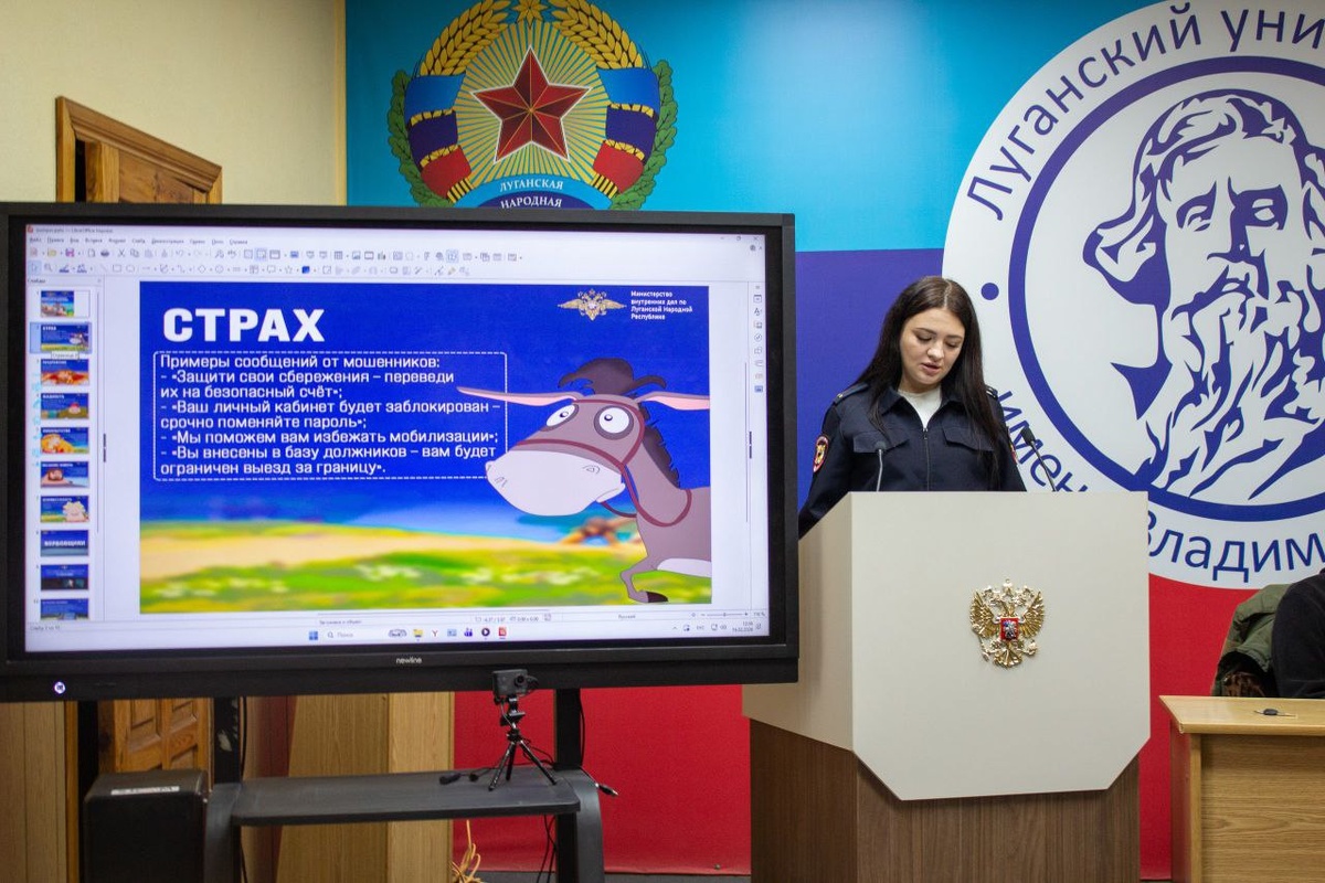Сотрудник Центра по противодействию экстремизму МВД по Луганской Народной Республике совместно с представителем управления по борьбе с противоправным использованием информационно-коммуникационных технологий МВД по Луганской Народной Республике 16 февраля провели интерактивную лекцию для студентов Экономического института Луганского государственного университета имени Владимира Даля. ❗️Темой стала одна из самых важных проблем современности – экстремизм и терроризм. В ходе мероприятия спикеры разъяснили ключевые понятия, связанные с экстремизмом, терроризмом и радикализмом. Чтобы слушатели лучше усвоили материал, лекторы приводили конкретные примеры из практики, а само общение проходило в формате открытого диалога — студенты могли задать вопросы и получить на них развёрнутые ответы. 📌Особое внимание было уделено статье Уголовного кодекса РФ, регулирующей ответственность за экстремистскую деятельность. Спикеры отметили, что за 2025 год в ЛНР за экстремистские действия было привлечено