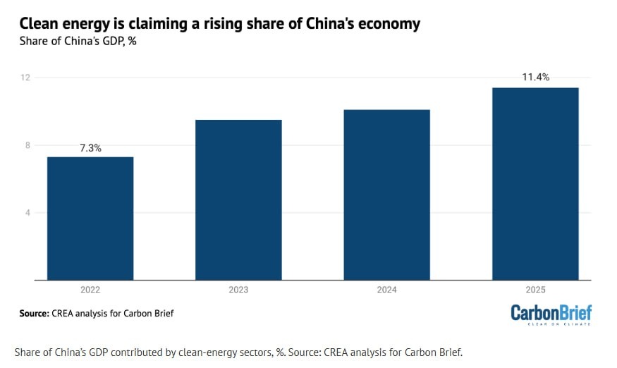 По итогам 2025 г секторы чистой энергетики в КНР выросли до рекордных $2,1 трлн, что эквивалентно 11,4% ВВП Китая