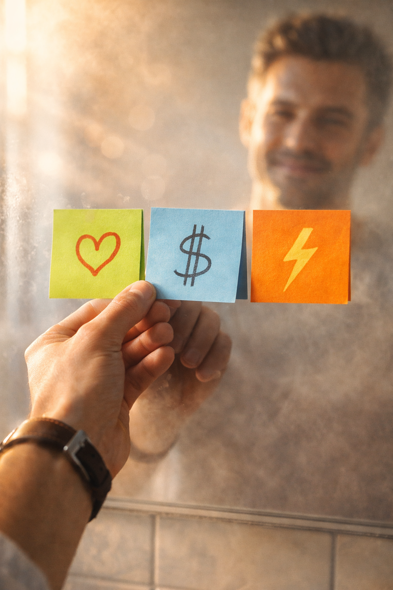 Первый человек, которому мы врём чаще всего - это мы сами. Чтобы обрести ясность, используйте лайфхак от меня и моих гостей: наклейте на зеркало в ванной три стикера: Здоровье, Отношения, Деньги