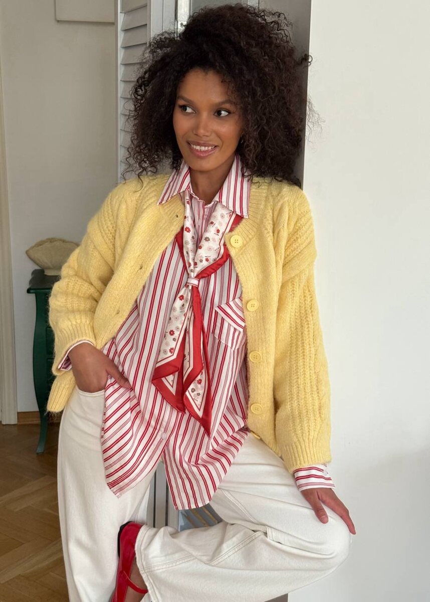 💛 Несмотря на мороз за окном, душа уже требует тепла и цвета! Собрали жизнерадостный образ с новинкой: - рубашка с галстуком «Дуся»; - кардиган объемной вязки; - белые джинсы. А вы уже ждёте весну?