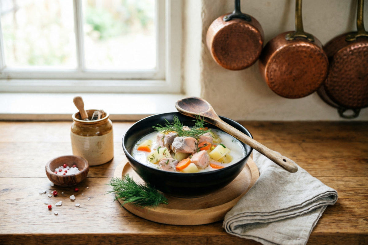 Финская уха «лохикейтто» родом из прибрежных регионов Финляндии, где лосось был основным продуктом. В отличие от русской ухи (которая готовится слоями и без молочных продуктов), финский вариант включает картофель и сливки — это влияние шведской кухни. Название «лохи» означает «лосось», «кейтто» — «суп». Традиционно его готовят в медных котлах на открытом огне, но в домашних условиях ключ — в бережном отношении к сливкам и свежей рыбе.